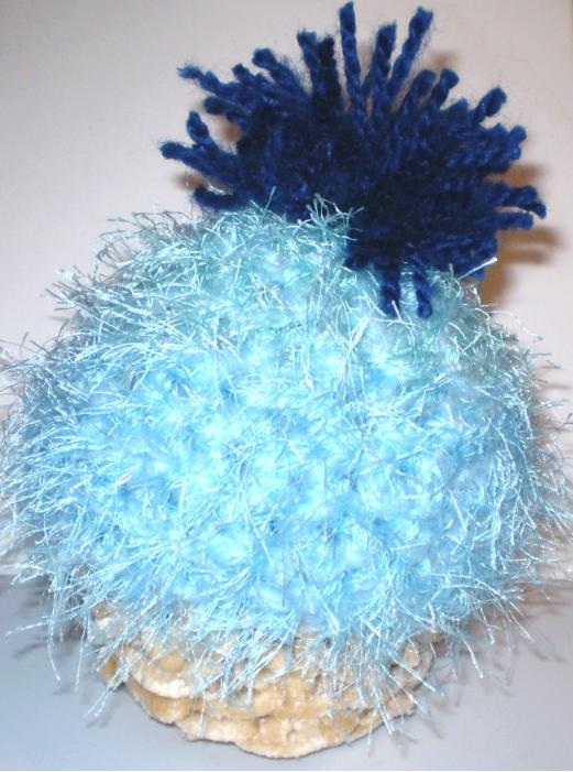 Click picture below to view full size image.  | #7011 Crocheted Cupcake (Hues of Blue/Beige) $15.00 No diet-breaking necessary to enjoy this soft, fun, crocheted cupcake! Stuffed with fiberfill. Style: Hues of Blue "Icing" with beige "Cake", topped with "Blueberry". Approx. 5 1/2" tall. Yarns: 50% Acrylic (Made in Romania). 25% Acrylic (Made in Turkey). 15% Polyester (Made in Turkey) & 10% Polyester (Made in China). Fiberfill: All new materials consisting of polyester fiber (Made in the USA). Crocheted in the USA of imported yarn. Spot clean with water only. THIS ITEM IS NOT A TOY. For use by adults for decorative purposes only. Caution: Flammable.