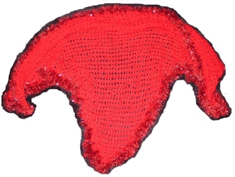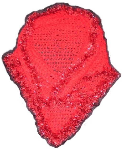 #7012 Red Triangle Shawl With Sparkling Trim $34.00 A sparkling and elegant way to wrap up and stay warm on cool days or nights! This red triangle shawl features soft, red Jiffy Mohair yarn and Fun Fur trim in a metallic red color. Approximate shawl shape when flat: