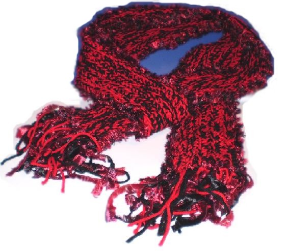 Click picture below to view full size image.  | #7013 Red/Black Gypsy Extra Long Scarf with Boa Trim $22.00 This long, luxurious scarf features red and black yarn and red and black boa yarn trim. The scarf can be worn wrapped around the neck once or twice for a long, draping look or can be doubled over with the ends pulled through the loop for a shorter look. Approx. 90" when measured from ends of fringe. Yarns: 90% Acrylic (Made in USA). 10% Polyester (Made in Canada). Crocheted in the USA using some imported yarn. Spot clean with water only. Caution: Flammable.