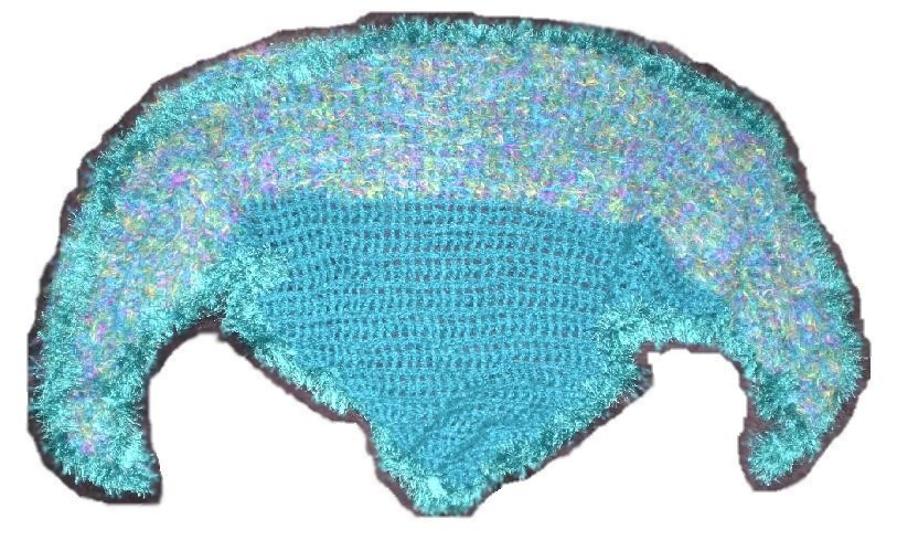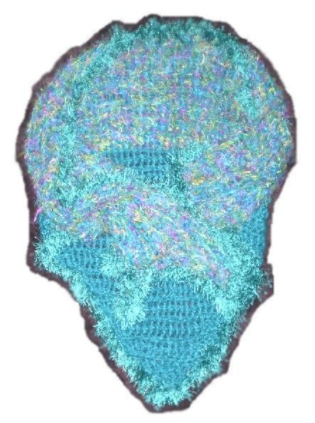 #7014 Turquoise Blue Triangle Shawl With Fun Fur Trim $40.00 Wrap up and stay warm on cool days or nights with this lovely turquoise blue triangle shawl. The shawl features soft Jiffy Mohair yarn, a pastel rainbow of fuzzy designer accent yarn along the top half, and Fun Fur trim around the edge. Approximate shawl shape when flat: