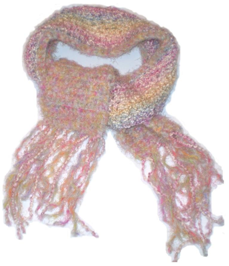 Click picture below to view full size image.  | NEW! #7016 Pastel Rainbow Regular Length Scarf with Fuzzy Multicolored Trim $22.00 This sweet pastel scarf is so soft and comfy! It features a pastel rainbow-colored yarn with a fuzzy multicolored trim. The scarf looks gorgeous when wrapped loosely around the neck. Approx. 65" when measured from ends of fringe. Yarns: 73.5% Acrylic & 1.5% Polyester (Made in USA). 9.25% Nylon, 7.5% Acrylic, 3% Polyester, 2.63% Alpaca & 2.63% Mohair (Made in China, Finished in Canada). Crocheted in the USA using some imported yarn. Spot clean with water only. Caution: Flammable.