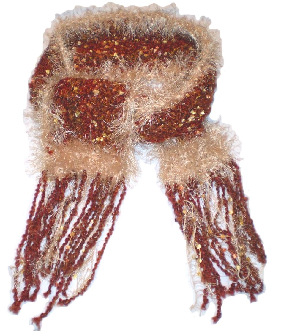 Click picture below to view full size image.  | NEW! #7017 Autumn Leaves Regular Length Scarf with Furry Trim $22.00 A beautiful scarf crocheted in the colors of autumn! It features a brown/rust colored yarn, an accent yarn in fall colors, and a neutral furry trim. Keep toasty and warm with this lovely scarf wrapped loosely around your neck! Approx. 66" when measured from ends of fringe. Yarns: 49% Acrylic & 1% Polyester (Made in USA). 35% Polyester (Made in China). 15% Polyester (Made in Turkey). Crocheted in the USA using some imported yarn. Spot clean with water only. Caution: Flammable.