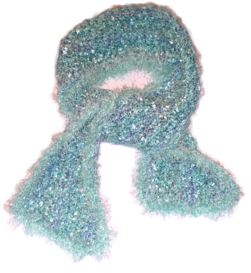 Click picture below to view full size image.  | NEW! #7018 Ice Blue Regular Length Scarf with Furry Trim $22.00 This scarf features yarn in multiple shades of blue with a light blue accent yarn and and a light blue furry trim. Wrap the scarf loosely around your neck for the perfect accessory for cold winter days! Approx. 59" when measured from end to end. Yarns: 63.7% Acrylic & 1.3% Polyester (Made in USA). 20% Polyester (Made in China). 15% Polyester (Made in Turkey). Crocheted in the USA using some imported yarn. Spot clean with water only. Caution: Flammable.