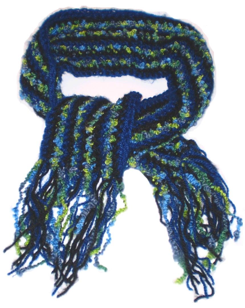 Click picture below to view full size image.  | NEW! #7019 Electric Striped Blue/Green/Black Long Scarf $22.00 A fun and funky striped scarf crocheted with dark blue, black, and blue/green varigated yarns. You'll be warm AND cool with this scarf wrapped around your neck! Approx. 70" when measured from ends of fringe. Yarns: 85% Acrylic (Made in Turkey). 15% Acrylic (Made in Canada). Crocheted in the USA using some imported yarn. Spot clean with water only. Caution: Flammable.