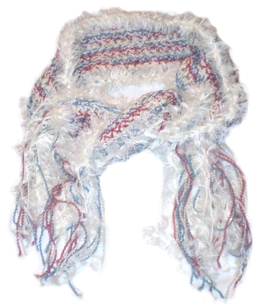 Click picture below to view full size image.  | NEW! #7020 Snowflake Long Scarf $22.00 A stunning striped scarf lined with faux mink fur. The scarf is crocheted from white, cream, pink, and blue yarns with a hint of metallic sparkle - just like falling snowflakes. Beautiful when wrapped loosely around the neck! Approx. 73" when measured from ends of fringe. Yarns: 31.6% Acrylic, 9.3% Acetate, & 1.1% Nylon (Made in Canada). 41% Acrylic, 16% Polyester, & 1% Metallic (Made in Turkey). Crocheted in the USA using some imported yarn. Spot clean with water only. Caution: Flammable.