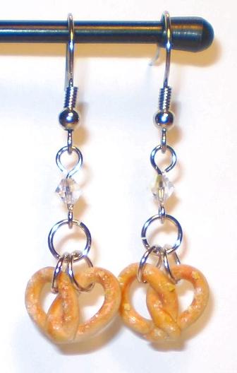 | Click picture to view larger image. | #2054 Pretzel Earrings With Swarovski Crystals $15.00 These salted pretzel earrings look so good! Each realistic-looking pretzel is hand-sculpted and dangles from a sparkly clear AB finish Swarovski crystal.