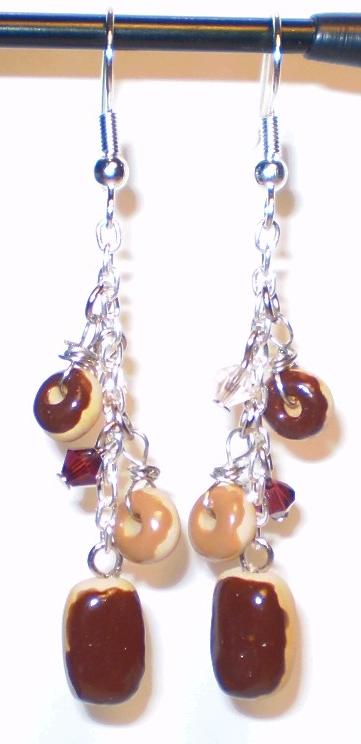 | Click picture to view larger image. | #2055 Donut Assortment Earrings With Swarovski Crystals $16.00 These earrings make me hungry! Each earring features a maple donut, a chocolate donut, a chocolate longjohn and sparkling Swarovski crystals in complementary colors. The realistic-looking donuts are hand-sculpted.