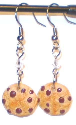 | Click picture to view larger image. | #2057 Chocolate Chip Cookie Earrings With Swarovski Crystals $15.00 These cookie earrings look so sweet! Each realistic-looking cookie is hand-sculpted and dangles from a sparkly clear Swarovski crystal.