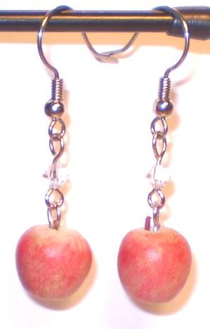 | Click picture to view larger image. | #2058 Apple Earrings With Swarovski Crystals $15.00 These tasty-looking apple earrings are hand-sculpted. Each apple dangles from a sparkly clear Swarovski crystal.