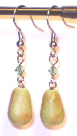 | Click picture to view larger image. | #2059 Pear Earrings With Swarovski Crystals $15.00 These cute pear earrings are hand-sculpted. Each pear dangles from a sparkly green Swarovski crystal.