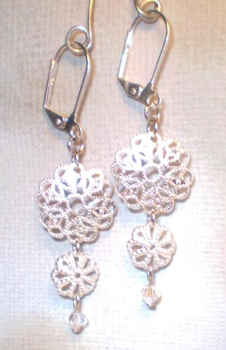 | #2025 Silver-Colored Snowflakes $7.00 I'm dreaming of a white Christmas! These earrings feature silver-colored snowflakes with sparkly Swarovski crystal dangles. Lever-backed.