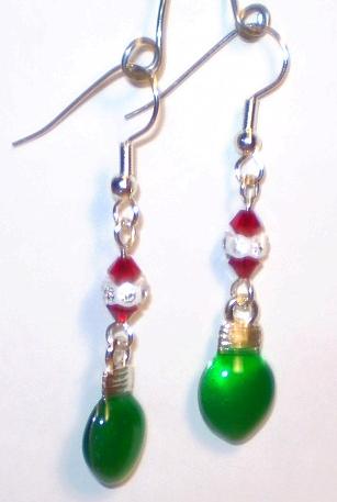 | #2063 Green Lights with Swarovski Crystal Studded Rondelles $10.00 Very merry earrings featuring cute green Christmas lights with red Swarovski crystals and rondelles studded with clear Swarovski crystals.