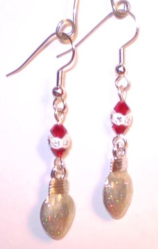 | #2065 Clear Glittery Lights with Swarovski Crystal Studded Rondelles $10.00 Very merry earrings featuring cute clear, glittered Christmas lights with red Swarovski crystals and rondelles studded with clear Swarovski crystals.