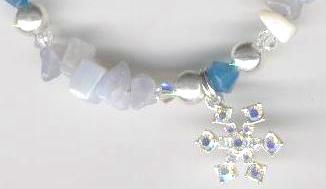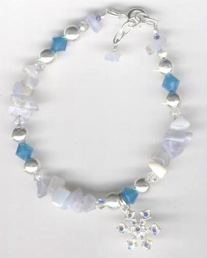 |  | NEW! #3065 Snowflake Charm Bracelet with Blue Lace Agate Chips and Swarovski Crystals $15.00 A piece celebrating the winter weather! A sparkly snowflake charm dangles from a bracelet of blue lace agate chips, Swarovski crystals, and silver-colored beads. Quick Size: 6" adjustable up to 6 3/4". See top of page for details on sizing. (Actual Length: Approx. 7" to 7 3/4".) Lobster clasp.