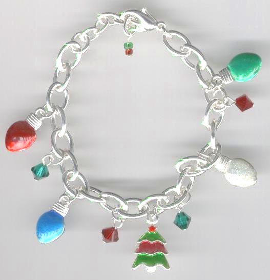 |  | NEW! #3066 Christmas Lights and Tree Charm Bracelet with Swarovski Crystals $16.00 What a fun way to show your holiday spirit! This charm bracelet features four Christmas light charms and one Christmas tree charm with Swarovski crystal dangles. Quick Size: 5 3/4" adjustable up to 7 1/4". See top of page for details on sizing. (Actual Length: Approx. 6 1/4" to 8".) Lobster clasp.