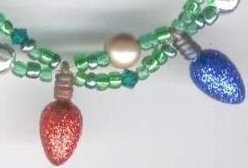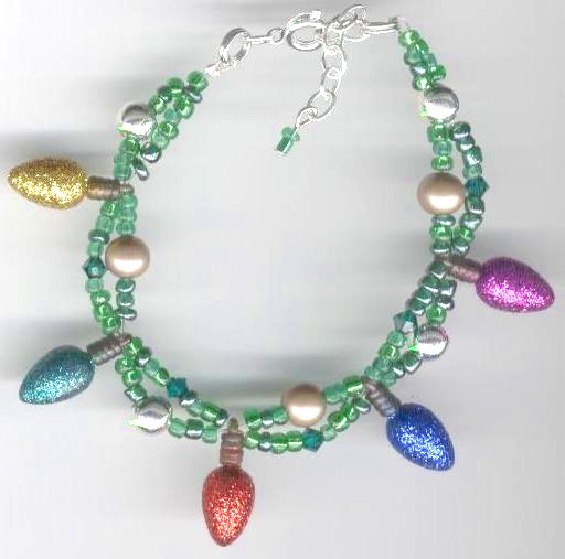 |  | NEW! #3067 Christmas-Tree-In-A-Bracelet $16.00 A portable, wearable version of a Christmas tree! This bracelet features multicolored, glittered acrylic light charms, Swarovski crystals, silver-colored and gold-colored bead "ornaments", and tiny green glass beads. Put it on and be what I like to call "insta-festive"! Quick Size: 6" adjustable up to 7 1/4". See top of page for details on sizing. (Actual Length: Approx. 7" to 8 1/4".) Lobster clasp.